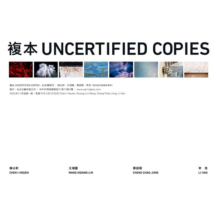 「複本」是白水邀請藝術家陳以軒、王湘靈、鄭詔蓉與李浩共同參與的出版與展覽計畫,每位藝術家編輯自己的攝影作品,共同組合成一本圖集。並且,邀請每一位讀者與觀眾用自己的手參與編輯、翻摺、裝訂並重新定義這本刊物,一起來完成無數「複本」。